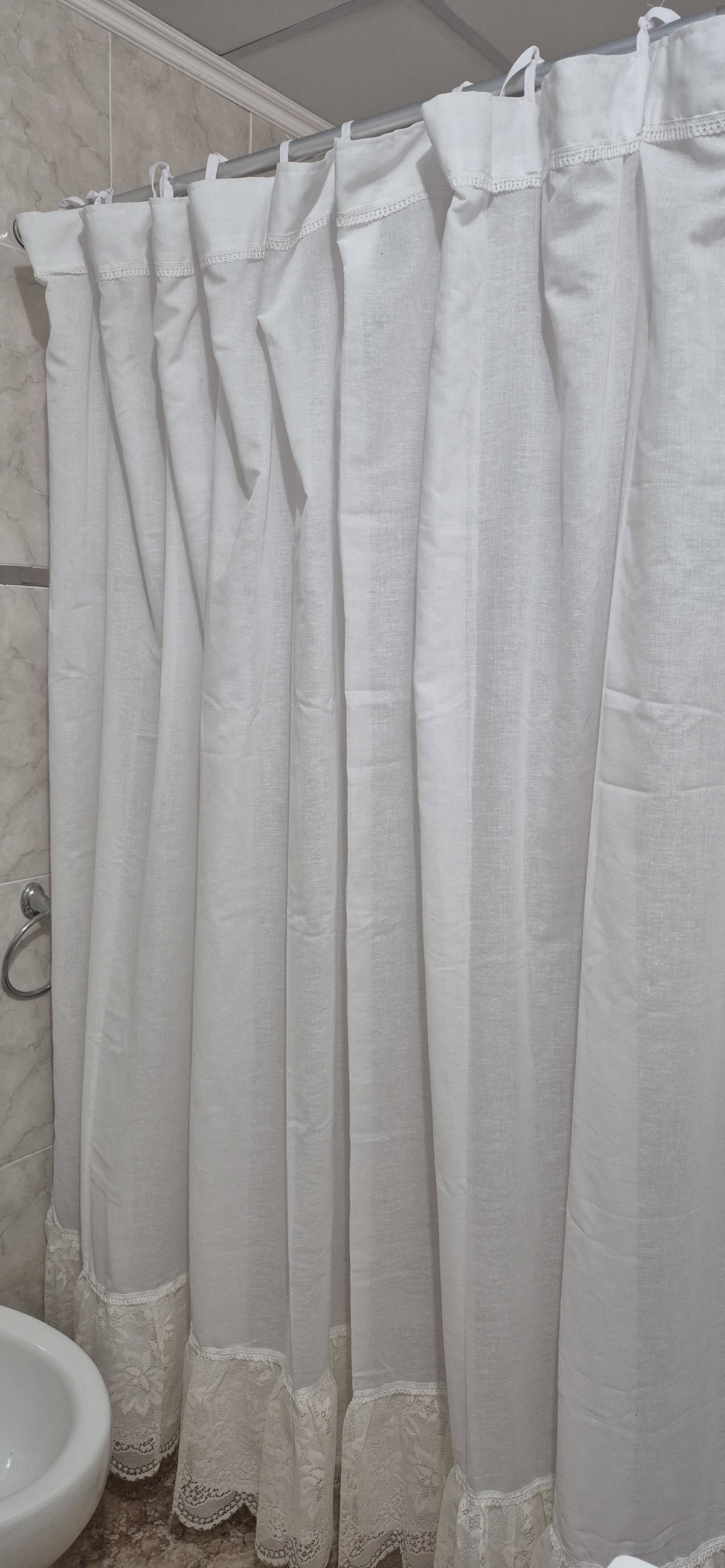 Nuestra cortina de baño está confeccionada en gasa de alta calidad, una tela liviana con terminaciones delicadas. Cada modelo incluye detalles únicos (puntillas / encajes / apliques), lo que la convierte en una pieza decorativa que aporta estilo y personalidad a tu baño.
