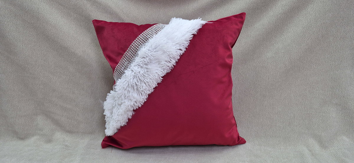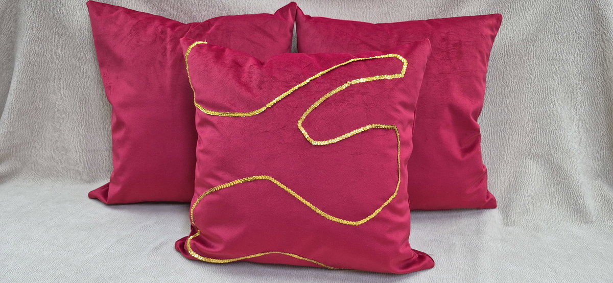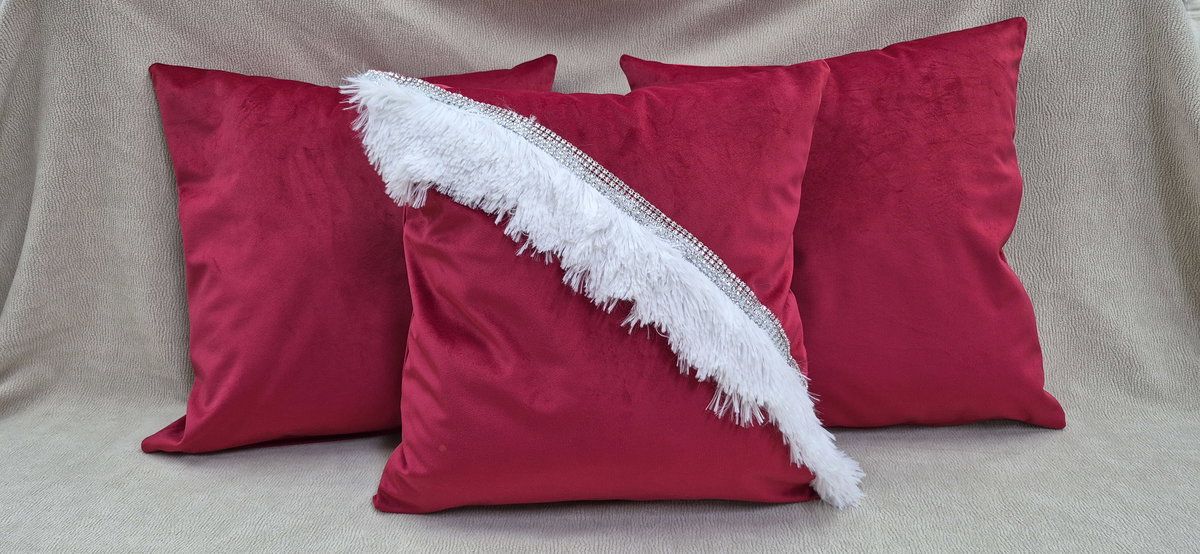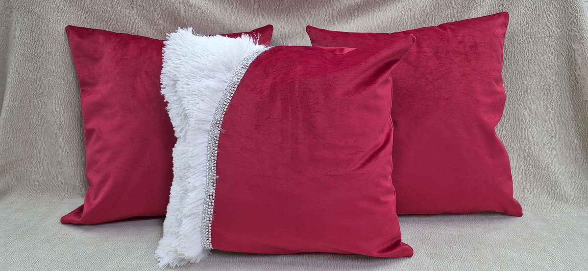Almohadones rojos aterciopelados con detalles en piel, lentejuelas o brillos. Suaves, elegantes y perfectos para dar un toque festivo o glam a cualquier ambiente. Incluyen relleno, listos para usar.
