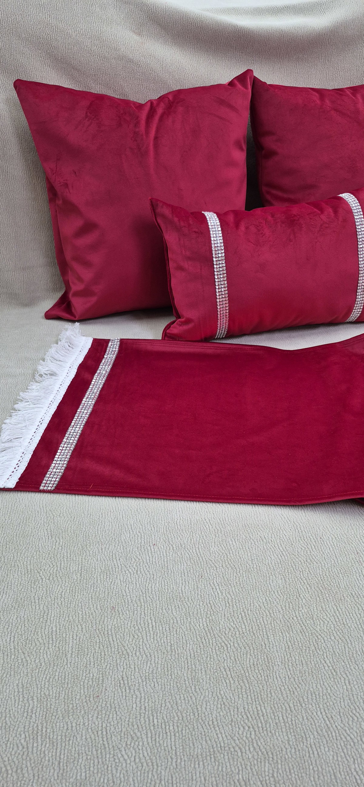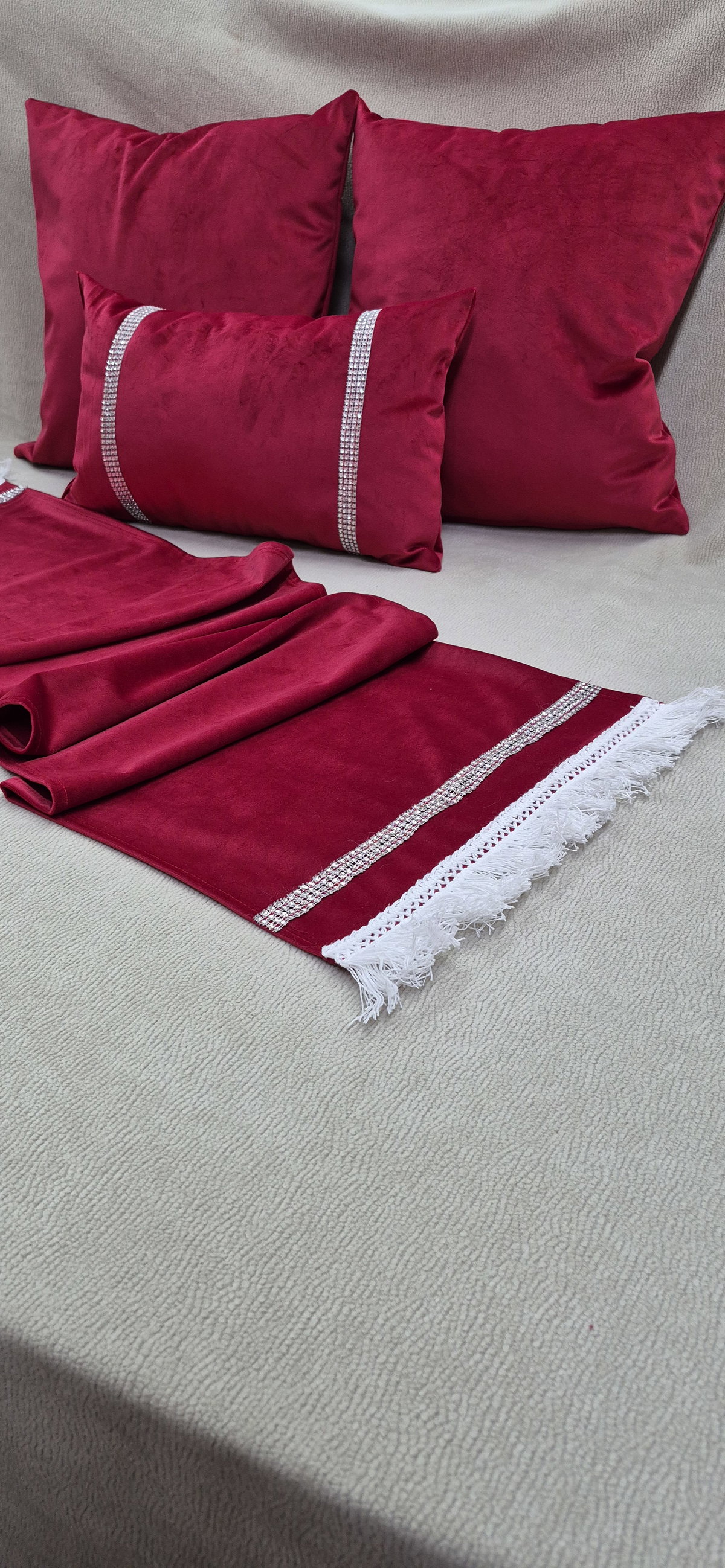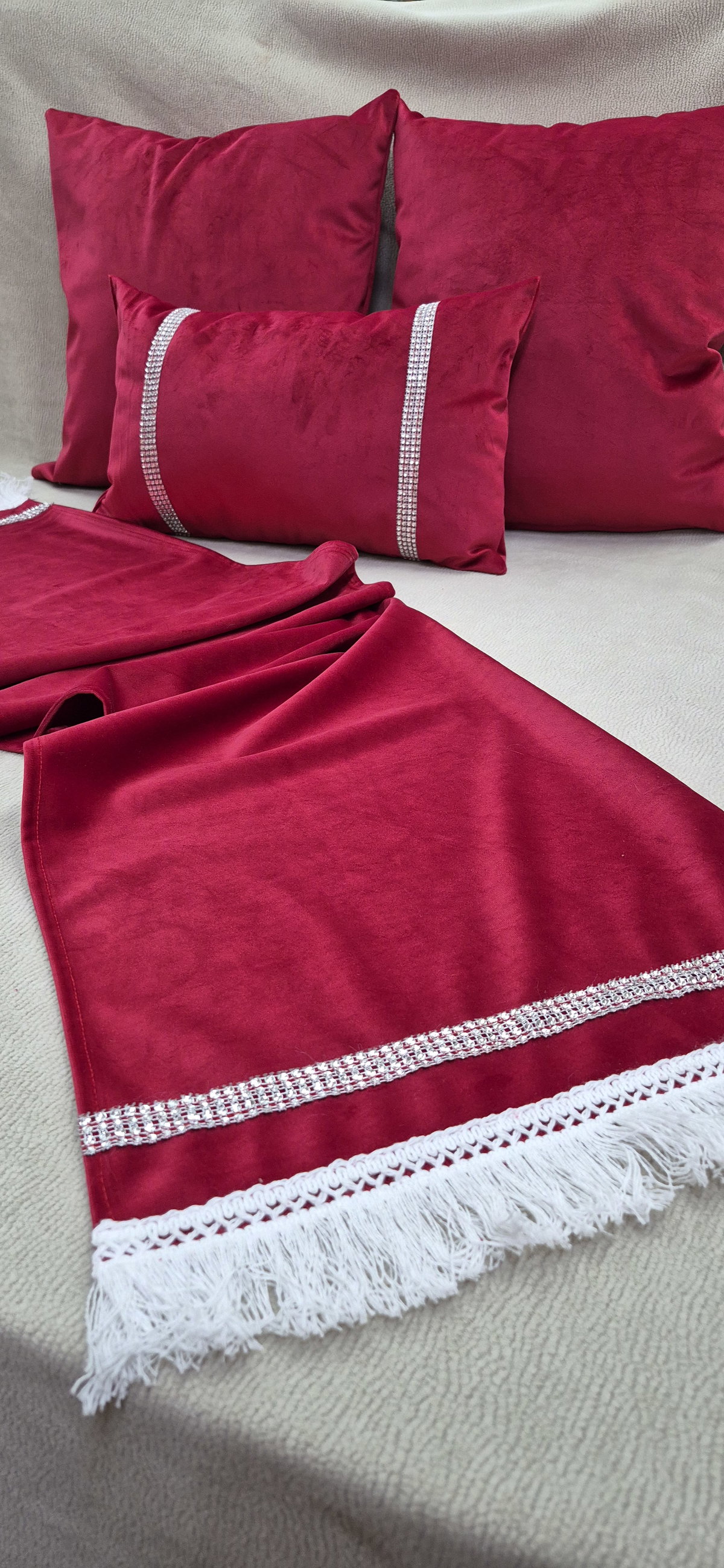 Caminos de mesa navideños en terciopelo rojo, ideales para darle un toque cálido y festivo a tu mesa. Incluyen detalles en puntilla y brillos, que aportan elegancia y un acabado sofisticado. Perfectos para realzar cenas, reuniones y decoración navideña.